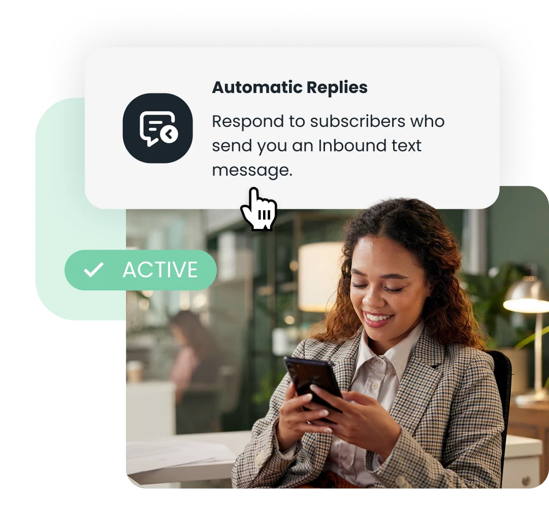 Textedly’s Automatic Replies feature enables your business to respond to inbound text messages even when you’re gone for the day, out on vacation, or simply not managing your SMS inbox. Keep customers happier with these instant replies.
