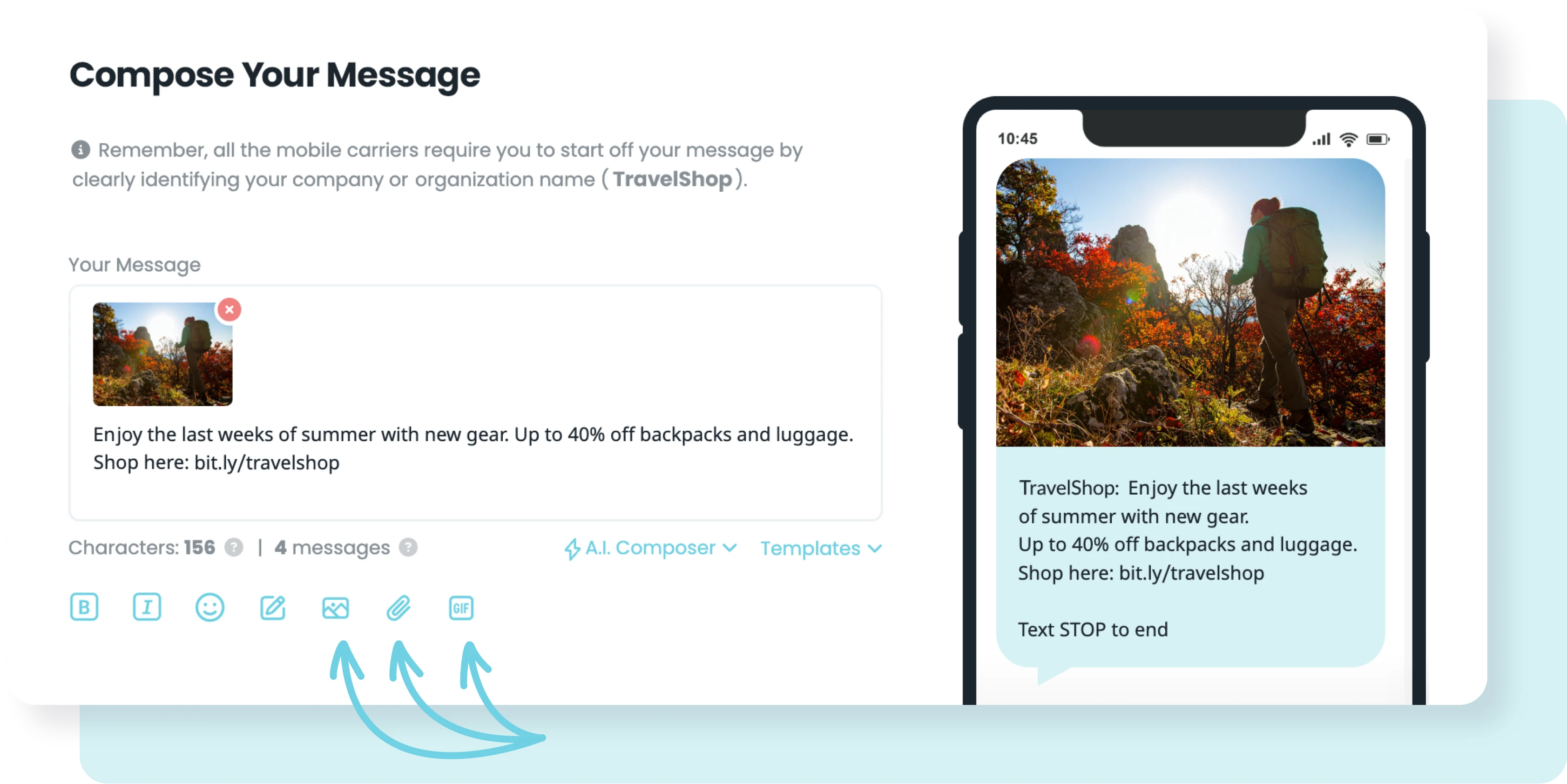 Bring your texts to life with multimedia attachments. Regardless of your texting use case, picture messaging makes your communication more dynamic, detailed, and engaging. With up to 1,600 characters and support for rich media, you can say more and show more with every send.